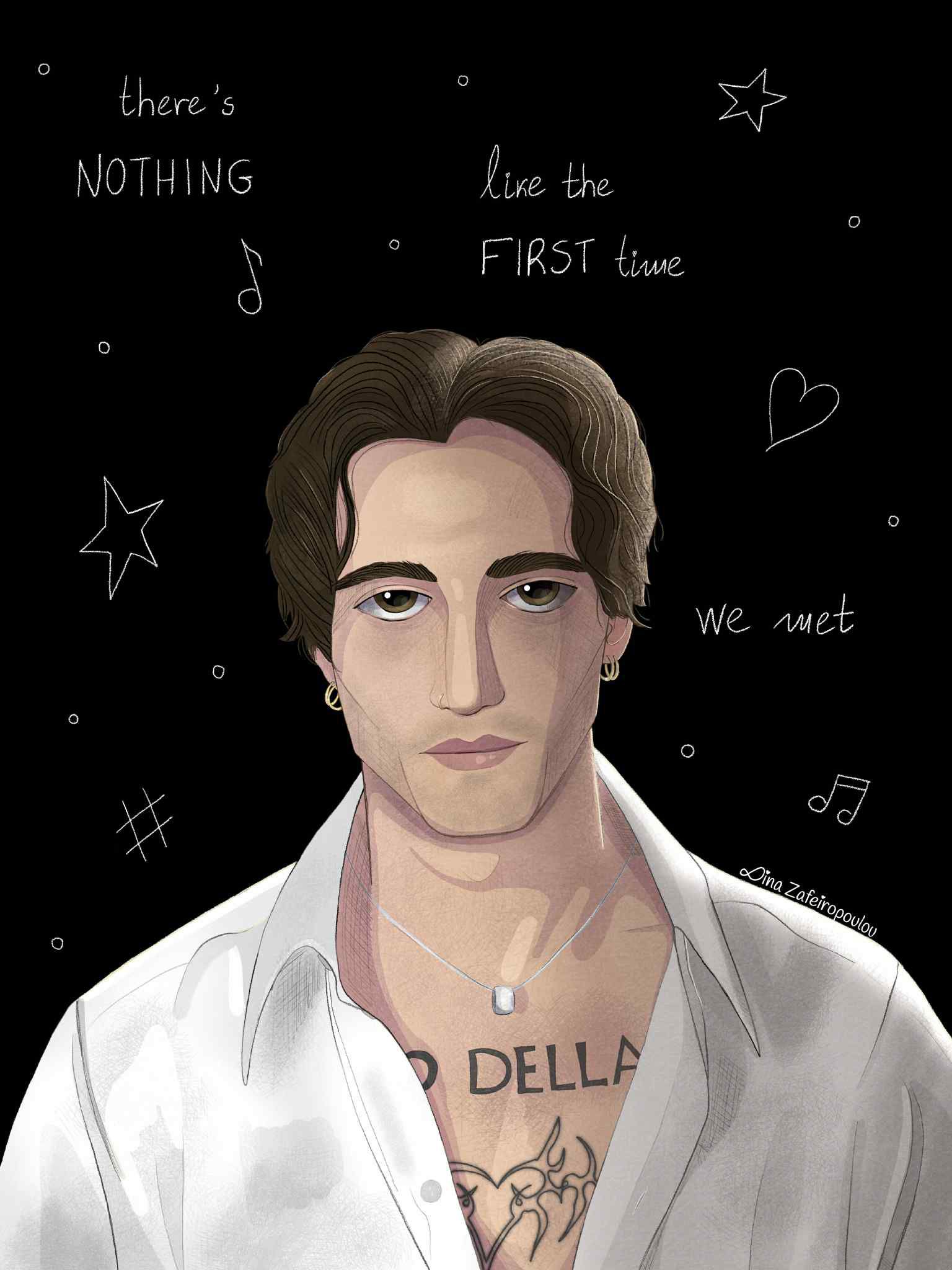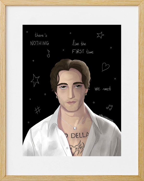 Bring the magnetic energy of Damiano David into your space with this original handmade art print. Ex Frontman of the Italian rock band Måneskin, Damiano is captured here in a dreamy, romantic moment—his signature tattoos and intense gaze framed by soft shadows and hand-written lyrics: “There’s nothing like the first time we met.”